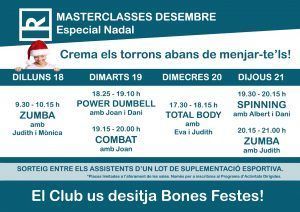 Aquesta setmana celebrem l’arribada de les festes nadalenques amb una setmana única i especial a les activitats dirigides. Tenim programades sis MASTERCLASSES, dirigides pels nostres tècnics, amb l’objectiu de gaudir la pràctica esportiva amb un caràcter nadalenc.