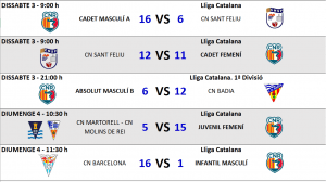 Per la seva part l’equip femení s’enfrontarà al CN Terrassa a partir de les 16 h a la capital vallesana, amb la tranquil·litat que els hi ha donat els últims resultats que les ha situat en una comodíssima 7ª posició, amb l’objectiu de millorar la classificació.