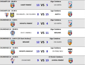 Per la seva part, l’equip femení s’enfrontarà al CN Mataró també aquest dissabte, a Can Rosés a partir de les 19:45h. Veniu a animar-les! Us hi esperem. El calendari complert es pot trobar aquí.