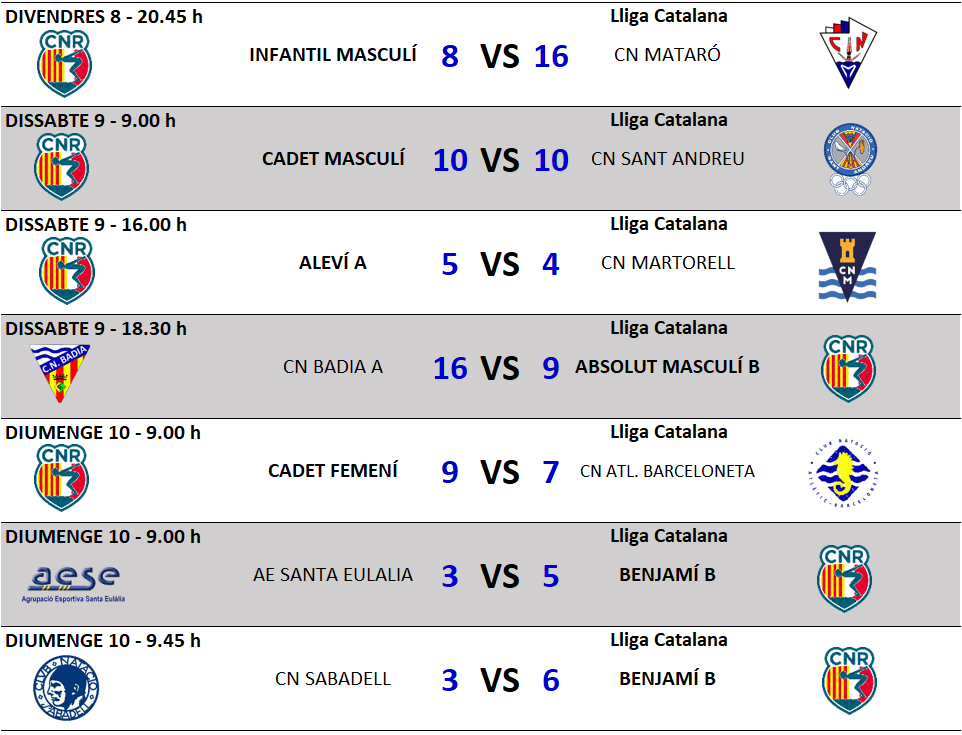 Per la seva part, l’equip masculí continua amb dinàmica guanyadora. Dissabte en el seu desplaçament a Madrid es va imposar de manera clara al CN la Latina amb un 9-13. Amb aquest resultat els nois del Dani Gómez continuen encapçalant la classificació juntament amb el CN Sant Feliu. Aquest cap de setmana tenen descans per la celebració de la Copa del Rei.