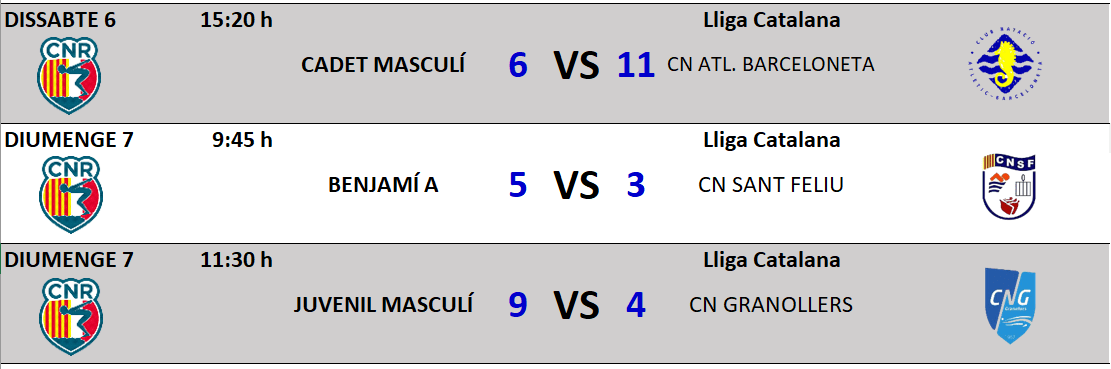 Aquest dissabte l’equip femení no te competició i el masculí s’enfrontarà al CN Premià a Can Rosés a partir de les 18h.